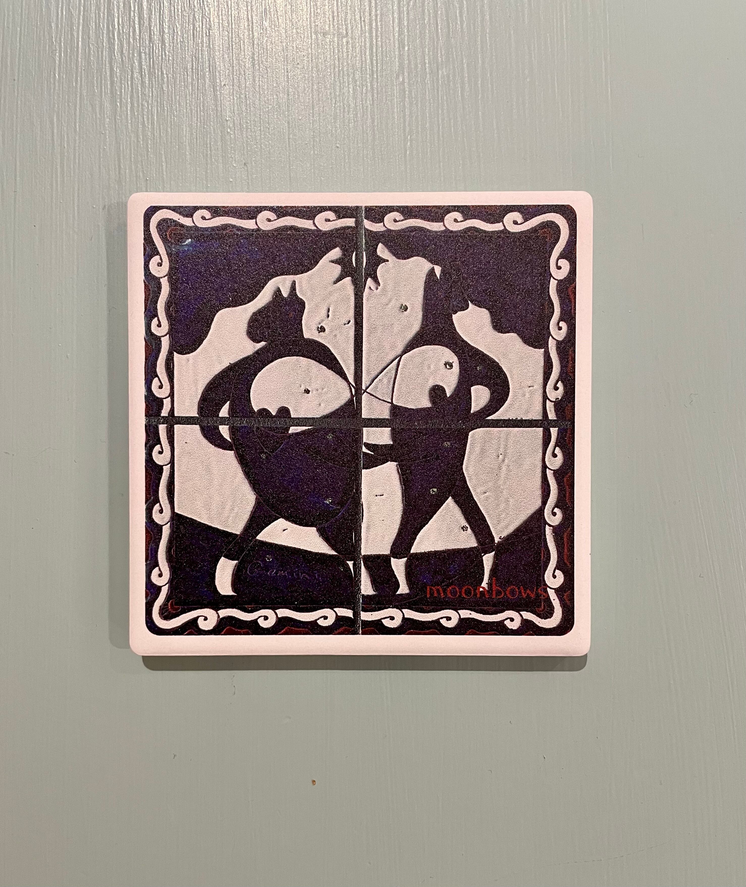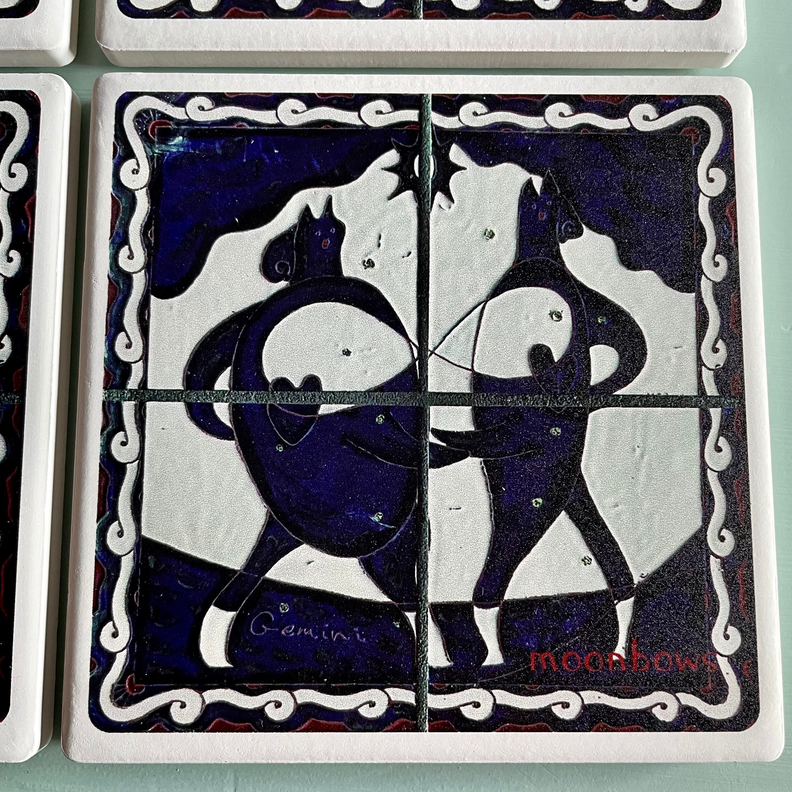 チヒロオリジナルの「双子座」のタイル、白雲石の白地コースターにプリントしました。